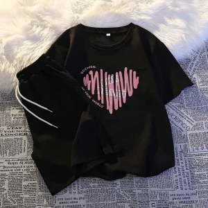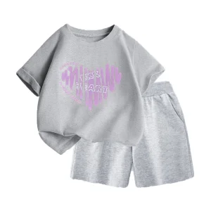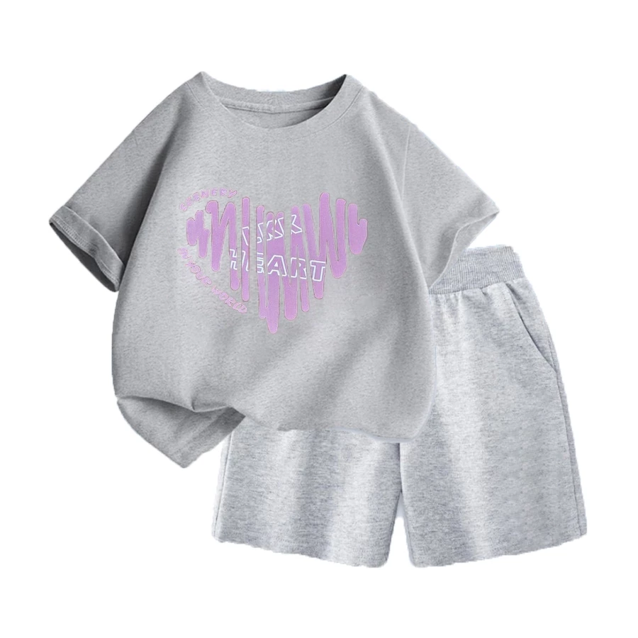 Thiết kế trẻ trung, hiện đại: Áo phông cổ tròn kết hợp cùng quần đùi ống rộng năng động. Họa tiết trái tim phối chữ cách điệu tạo nên nét vừa nữ tính, vừa cá tính cho bé.